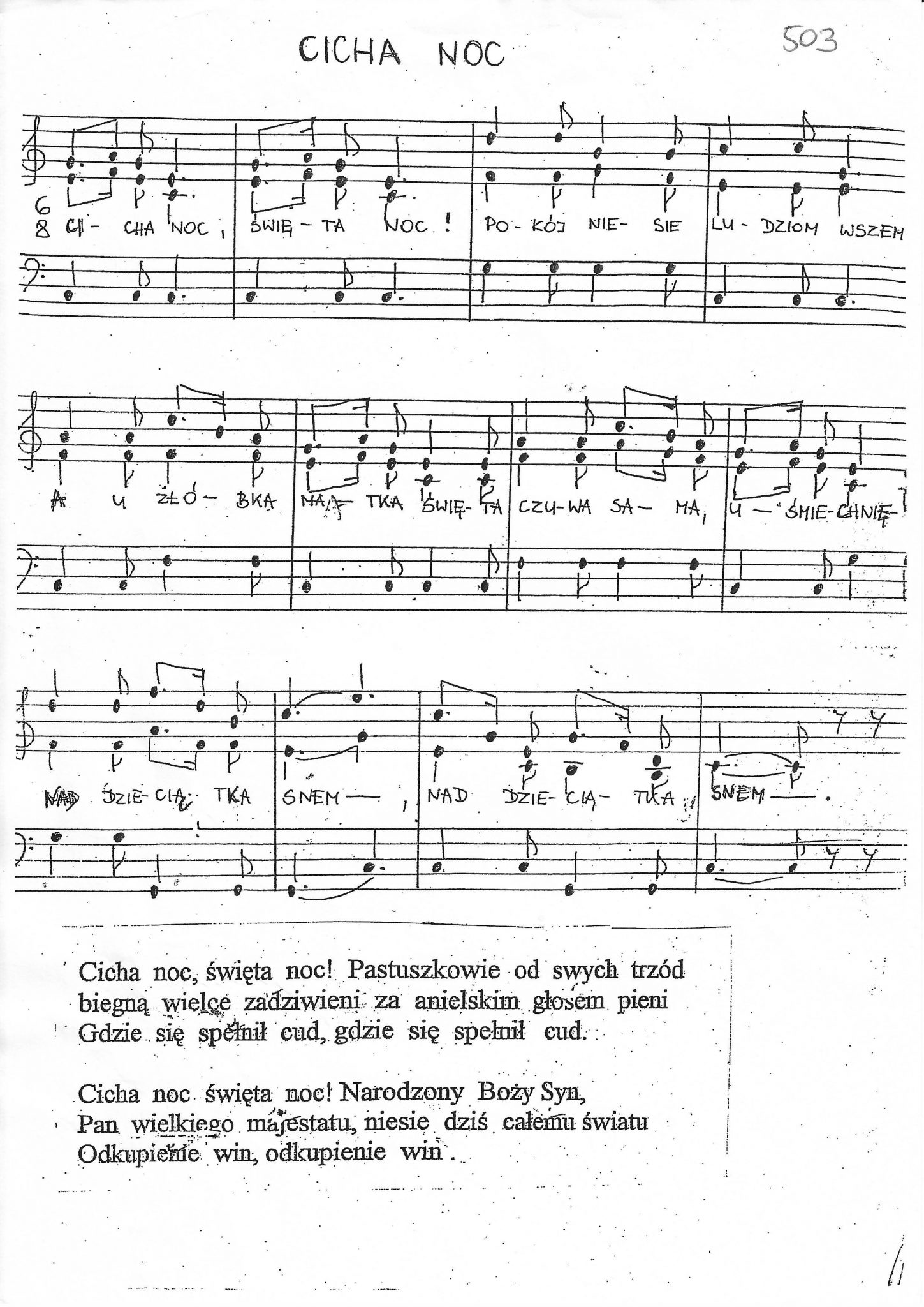 Cicha noc, święta noc, pastuszkowie od swych trzód, biegną wielce zadziwieni za Anielskim głosem pieni, Gdzie się spełnił cud, gdzie się spełnił cud.