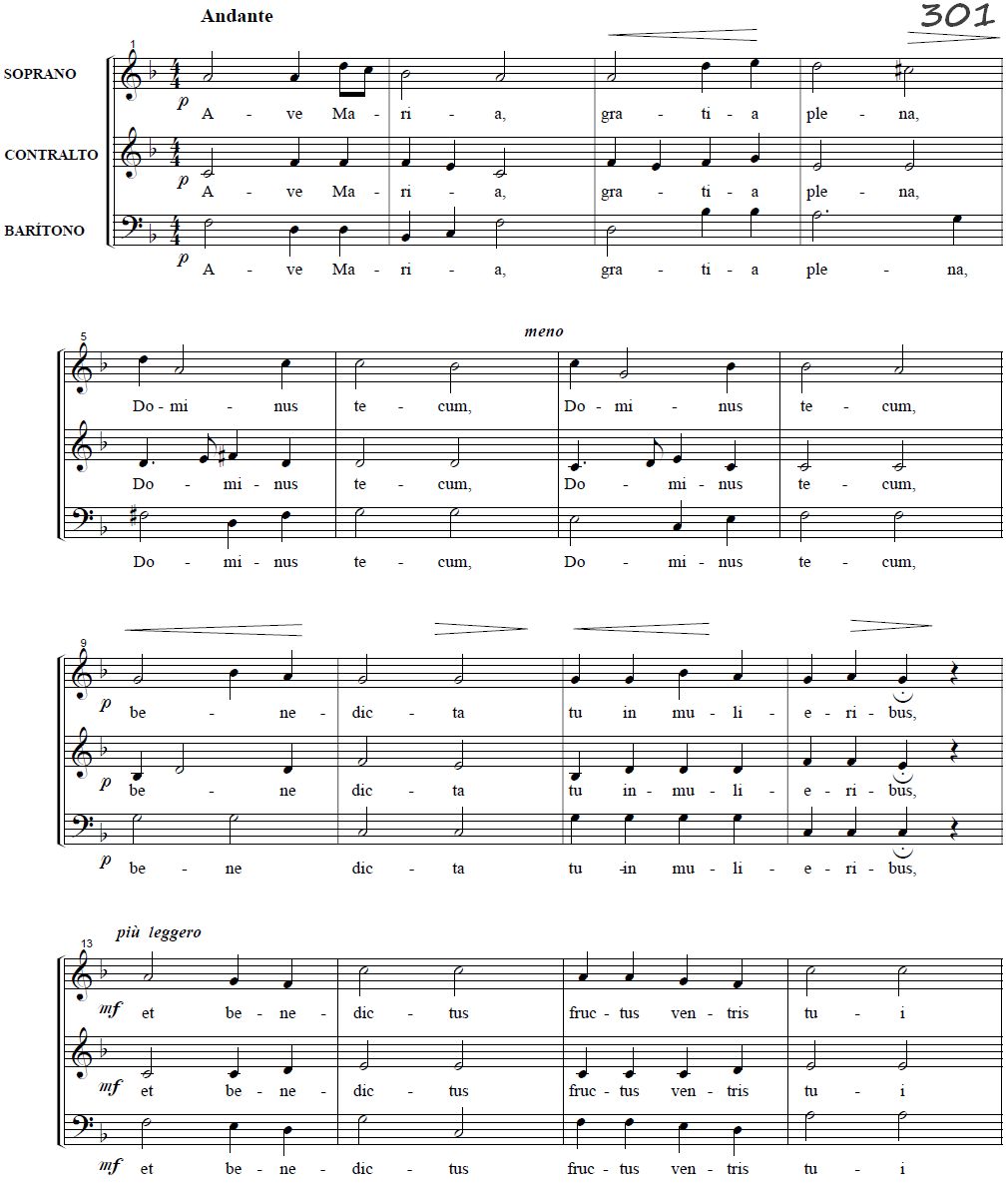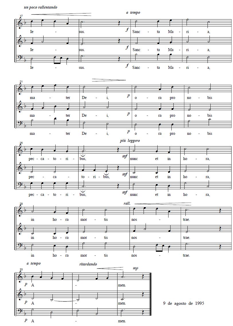 Ave Maria (Ramiro Real) Opublikowano 3 lutego 20203 lutego 2020 [data] przez Maciej Matysiak Ave Maria, Gratia plena, Dominus tecum, Dominus tecum Benedicta tu in mulieribus, et benedictus, fructus ventris tui, Jesus. Sancta Maria, mater Dei, Ora pro nobis peccatoribus, Nunc et in hora, in hora mortis nostrae. Amen. Plik do wydrukowaniaPobierz PDF Głosy Sopran Alt Bas Wszyscy