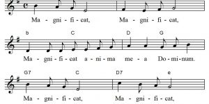 Magnificat, magnificat, magnificat anima mea Dominum. Magnificat, magnificat, magnificat anima mea. Głosy