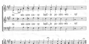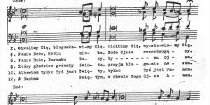 Chwała na wysokości Bogu, a na ziemi pokój ludziom dobrej woli. Chwalimy Cię. Błogosławimy Cię. Wielbimy Cię. Wysławiamy Cię. Dzięki Ci składamy, bo wielka jest chwała Twoja. Panie, Boże, królu …