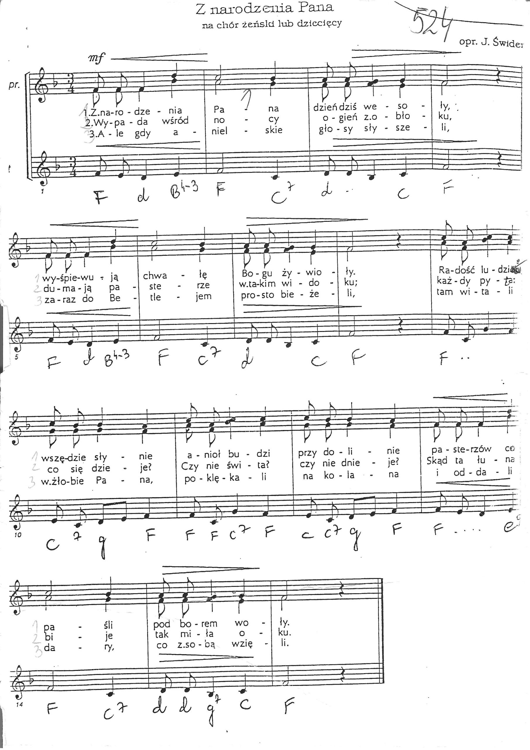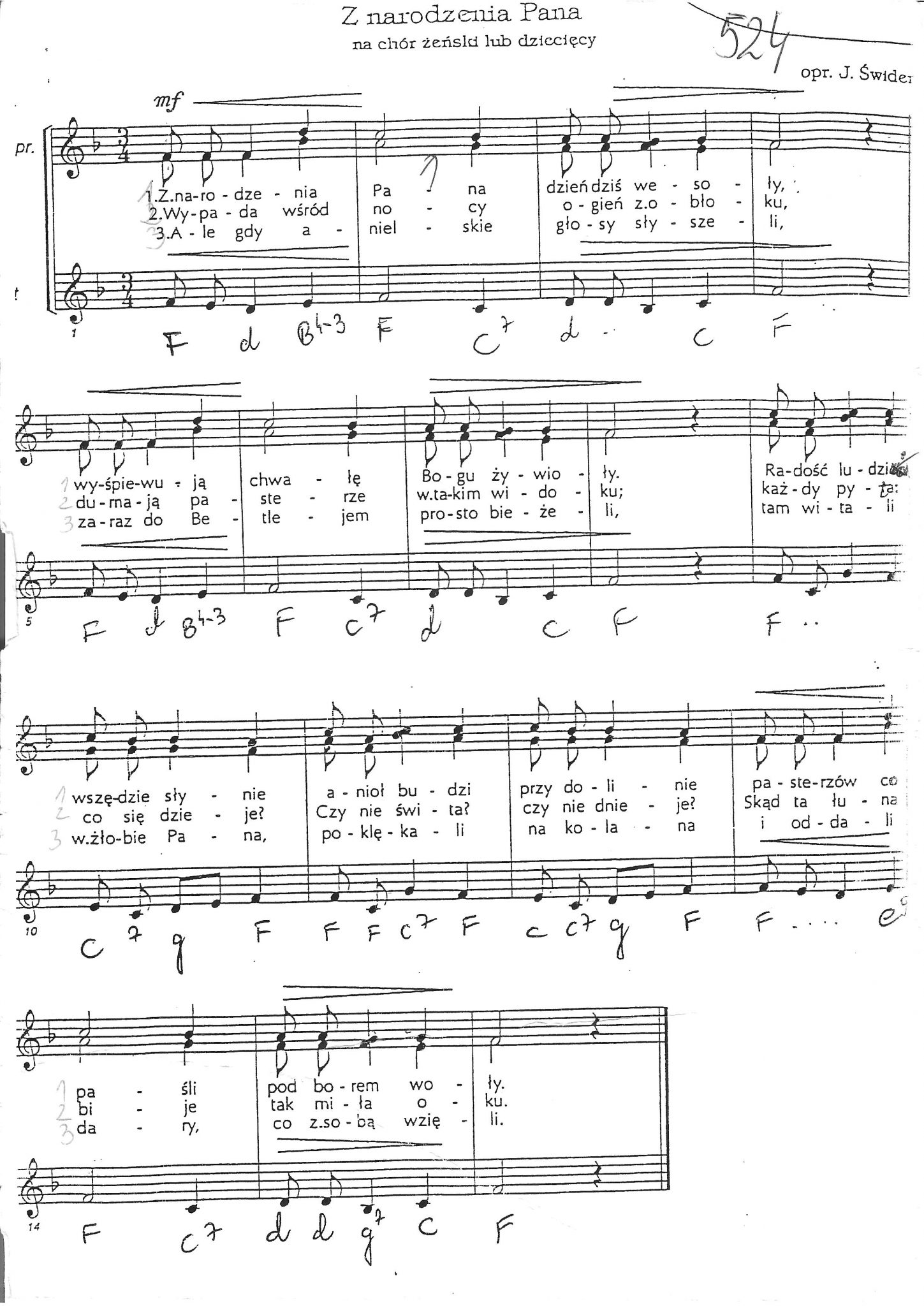 Z Narodzenia Pana dzień dziś wesoły. Wyśpiewują chwałę Bogu żywioły. Radość ludzi wszędzie słynie. Anioł budzi przy dolinie pasterzów, co paśli pod borem woły.